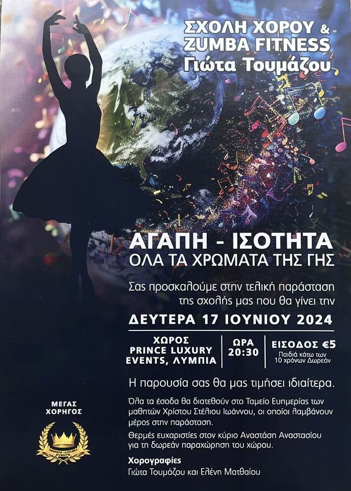 Με μεγάλη μας χαρά, τα παιδιά της σχολής και τα παιδιά του Ιδρύματος Χρίστου Στέλιου Ιωάννου, σας προσκαλούμε στην τελική τους παράσταση με φιλανθρωπικό σκοπό.